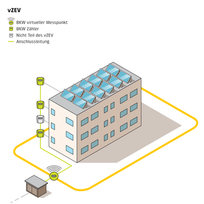 Der virtuelle Zusammenschluss zum Eigenverbrauch (vZEV) vereint smarte Technologie mit lokaler (und dezentraler) Energieversorgung. Intelligente Messsysteme (sogenannte Smart Meter) der BKW an Verbrauchsstellen wie Wohnungen, Büros oder Gebäuden erfassen den Stromfluss und werden in einem virtuellen Messpunkt zusammengefasst.